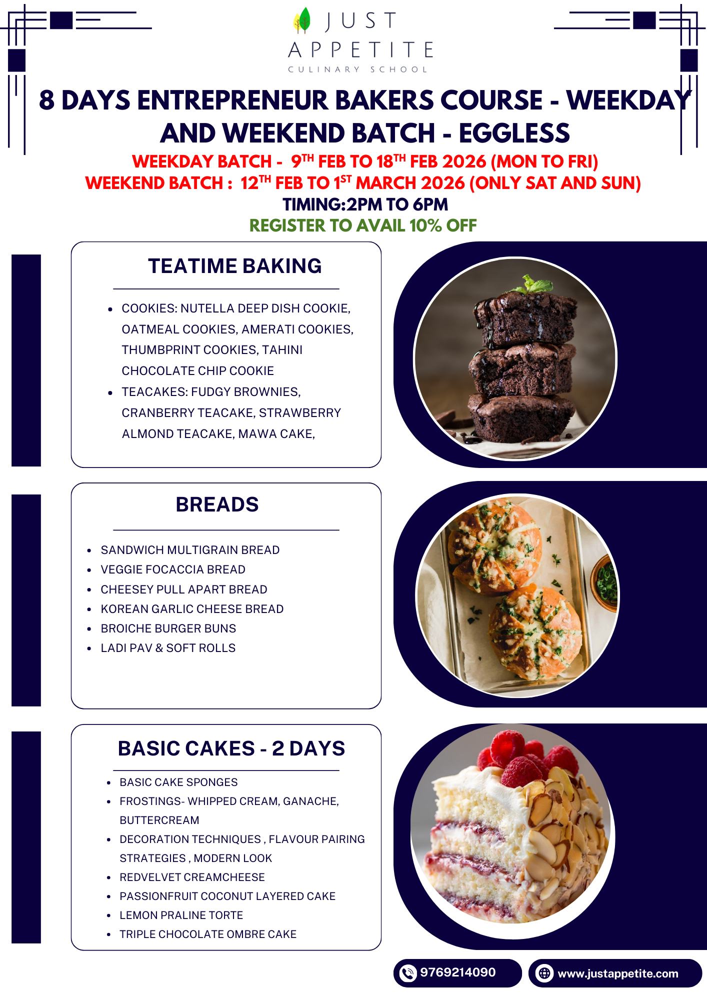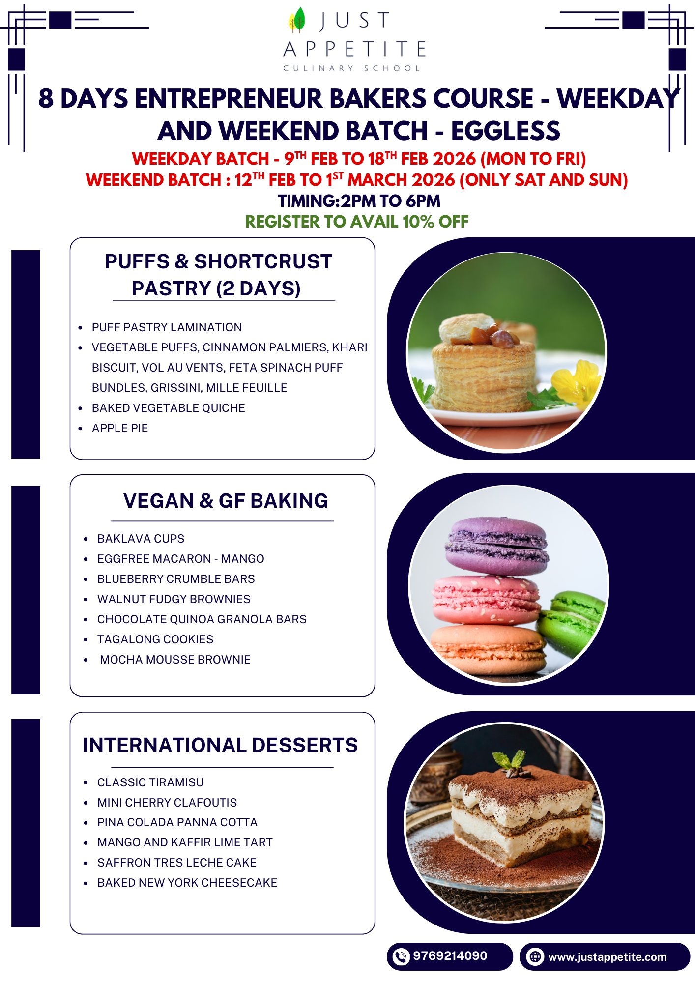 Have you ever dreamt of becoming a baker or are you looking to enhance your baking skills? This comprehensive course by Just Appetite is the perfect place to start! We cater to aspiring bakers with no prior experience and baking enthusiasts who want to stay updated on the latest trends.